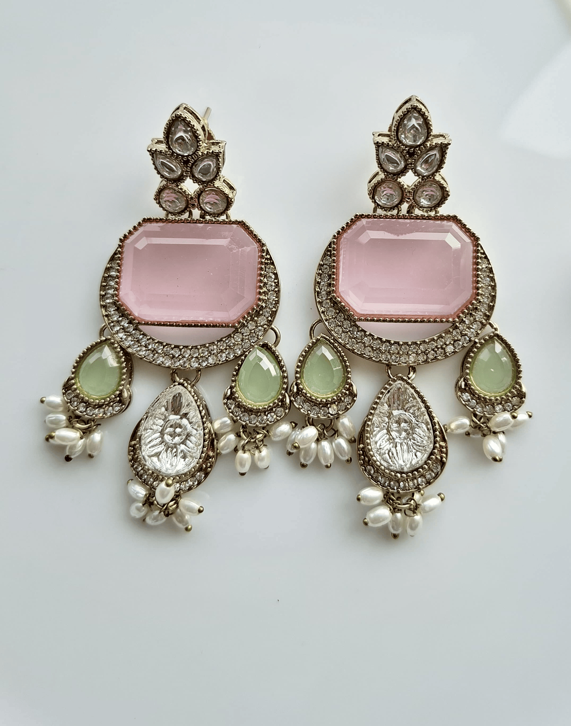Step into the spotlight with our exquisite Pastel Enchanted Garden Earrings. These stunning statement pieces artfully blend vintage charm with a modern color palette. Featuring a bold, emerald-cut rose pink centerpiece framed by shimmering micro-stones, they are accented with refreshing mint green drops and delicate seed pearl clusters. Perfect for festive occasions, weddings, or high-fashion events, they offer a sophisticated "Chandbali" inspired silhouette with a modern twist.